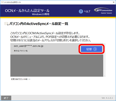 Windows10メールアプリにOCNのActiveSync方式のメール設定が存在する場合、既存の設定値を読み取って、POP/SMTPサーバーの設定を行います。